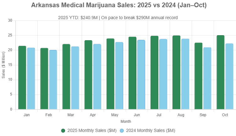 LITTLE ROCK, Ark. — Arkansas’s medical marijuana industry is charging toward a historic milestone, with patients spending more than $240.9 million at state dispensaries from January through October 2025 — a $13.1 million increase over the same period last year.