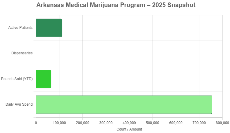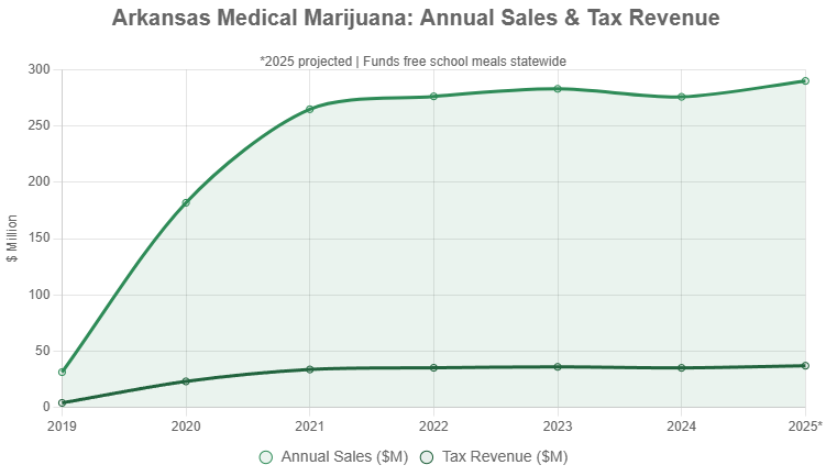 The boom translates directly to public benefits: Through October, medical marijuana taxes (6.5% sales tax plus 4% cultivator privilege) have generated about $28 million, with estimates of $30-33 million by year-end. These funds are dedicated to Arkansas’s free school meals program, combating food insecurity for thousands of students.